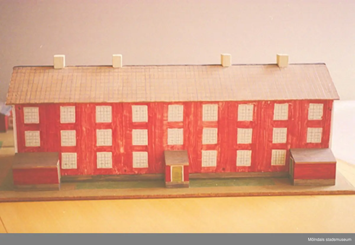 Ett rött bostadshus med tio fönster i rad, tre våningar högt, och tre entréer. På taket finns fyra skorstenar. Vid sidan av ligger två mindre stugor. Huset är en kopia av "Byggninga" som var arbetarbostäder till Anderstorps fabriker i Lindome. Se även 1994_0992. Harry Bergmans "gubbar" (träfigurer).