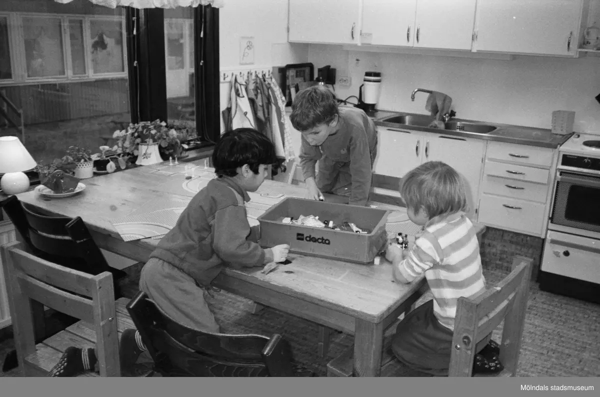 Tre pojkar sitter/står runt ett furubord i köket på Katrinebergs daghem. De pysslar med småprylar som ligger i en trälåda på bordet. Vid bordet står köksstolar och trip trap stolar.