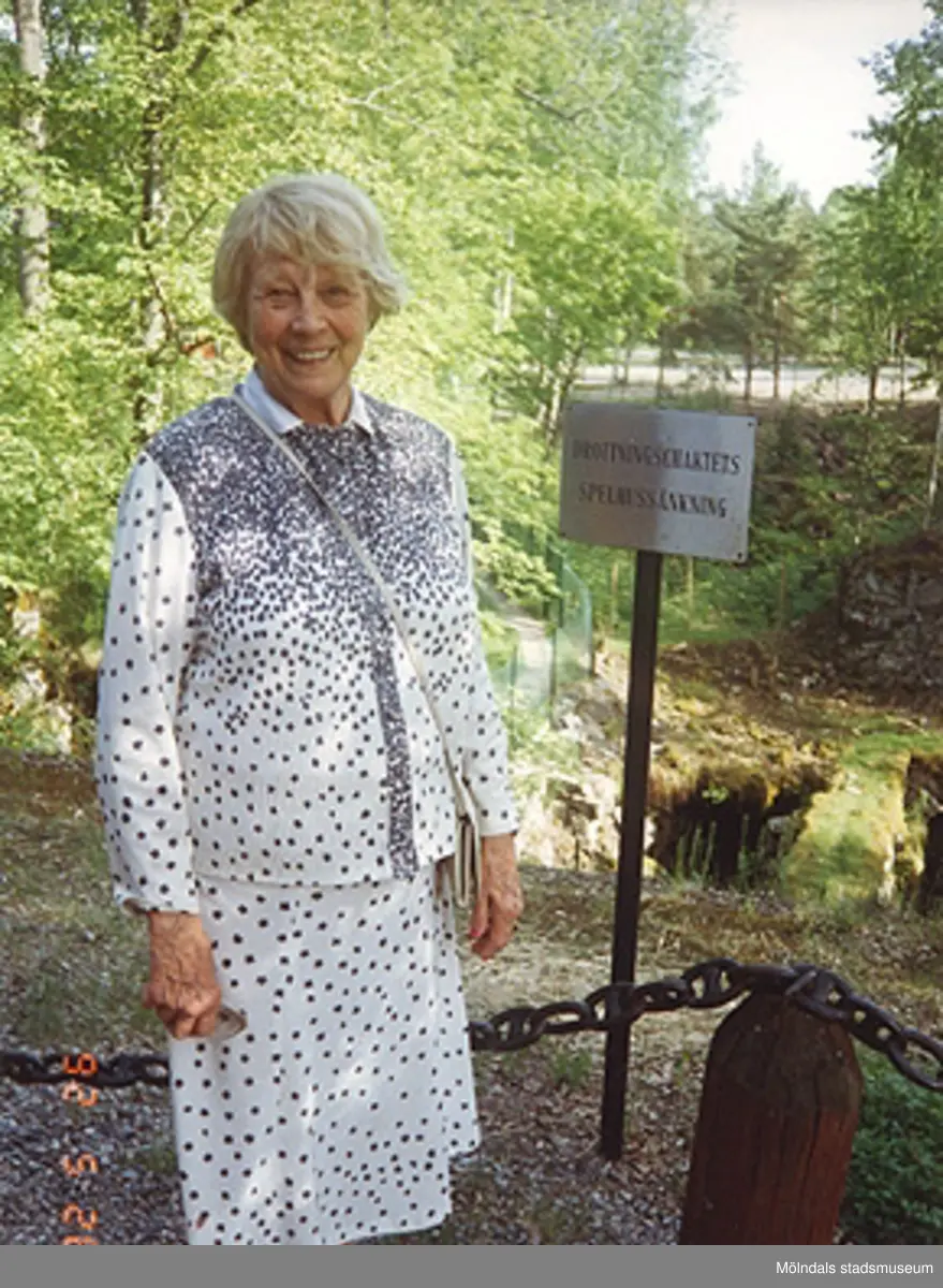 Ett porträtt av Ingvor Gullers (1914 - 2009) när hon står vid skylten Drottningschaktets spelhussänkning (troligtvis i Stockholm), 28 maj 1992.