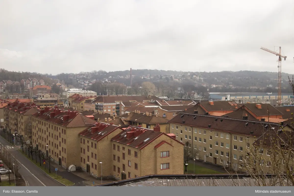 Vy österut från Fässbergs kyrka mot Tempelgatan till vänster och Bergmansgatan till höger. En del av Mölndals centrum. Längst ner i bild ser man taket på P-huset vid Tempelgatan 6. Byggkranen till höger, står mitt i nybygget av SCAs nya kontorsbyggnad vid Mölndals bro. I fonden, höghusen i rött tegel, är bostadsområdet Silverskatten.