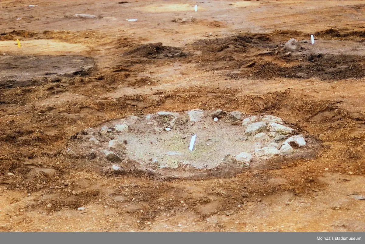 Titel: Arkeologisk undersökning av kokgropssystemet i Stretered, Kållered, våren 1998. Kultplats från bronsålder–äldre järnålder. Sammanlagt undersöktes 132 kokgropar som sträckte sig över en 250 m lång sträcka på krönet av en grusås. Kokgropssystemets norra del bestod av tre rader, medan det mot söder övergick till en rad.
