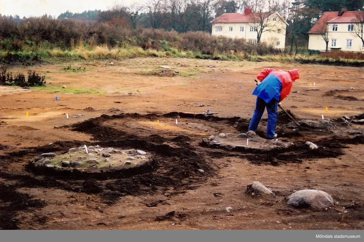 Titel: Arkeologisk undersökning av kokgropssystemet i Stretered, Kållered, våren 1998. Kultplats från bronsålder–äldre järnålder. Sammanlagt undersöktes 132 kokgropar som sträckte sig över en 250 m lång sträcka på krönet av en grusås. Kokgropssystemets norra del bestod av tre rader, medan det mot söder övergick till en rad.
