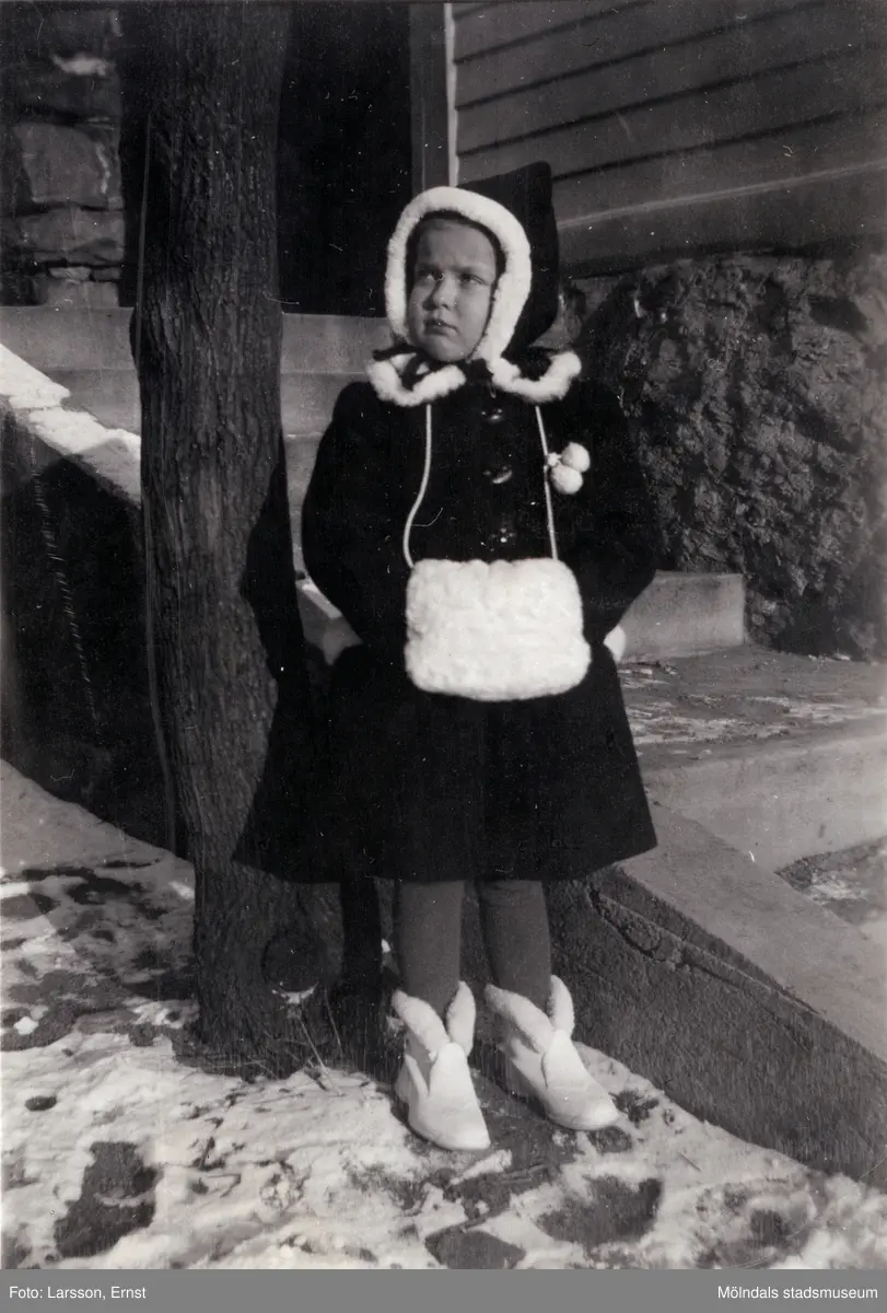 Berit Gustafsson (född 1936) vinterklädd i muff och kappa en kall vinter i början av 1940-talet. Platsen är i "Stusshålan", Kryssgatan i Mölndal.
