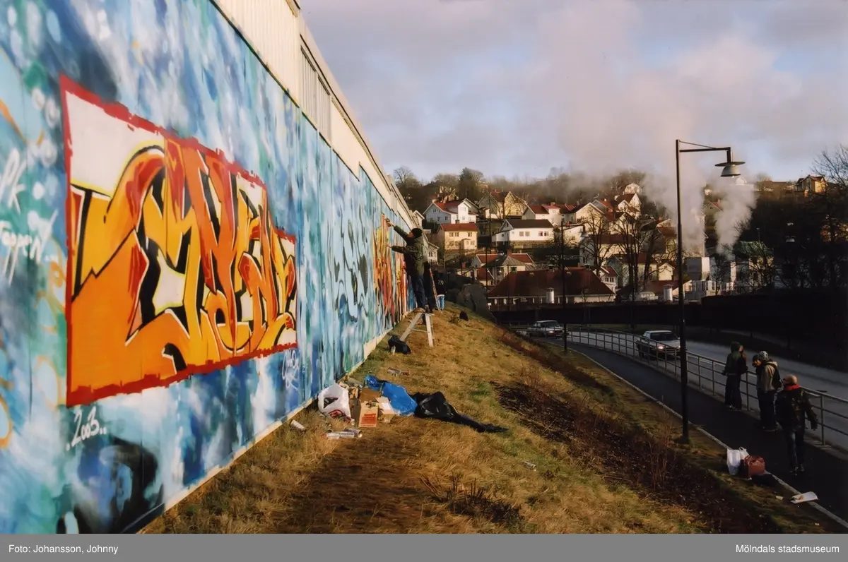Graffiti längs Kvarnbygatan i Mölndal, år 2003. Till höger ses muren tillhörande Papyrusområdet och i bakgrunden skymtar Mölndals kvarnby. Relaterade motiv: 2007_0266 - 0284.