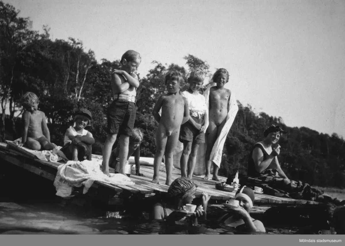 En kvinna och några barn sitter eller står på en flotte som ligger i Tulebosjön, 1930-tal. Framför flotten står två kvinnor som håller var sin kaffekopp i handen.