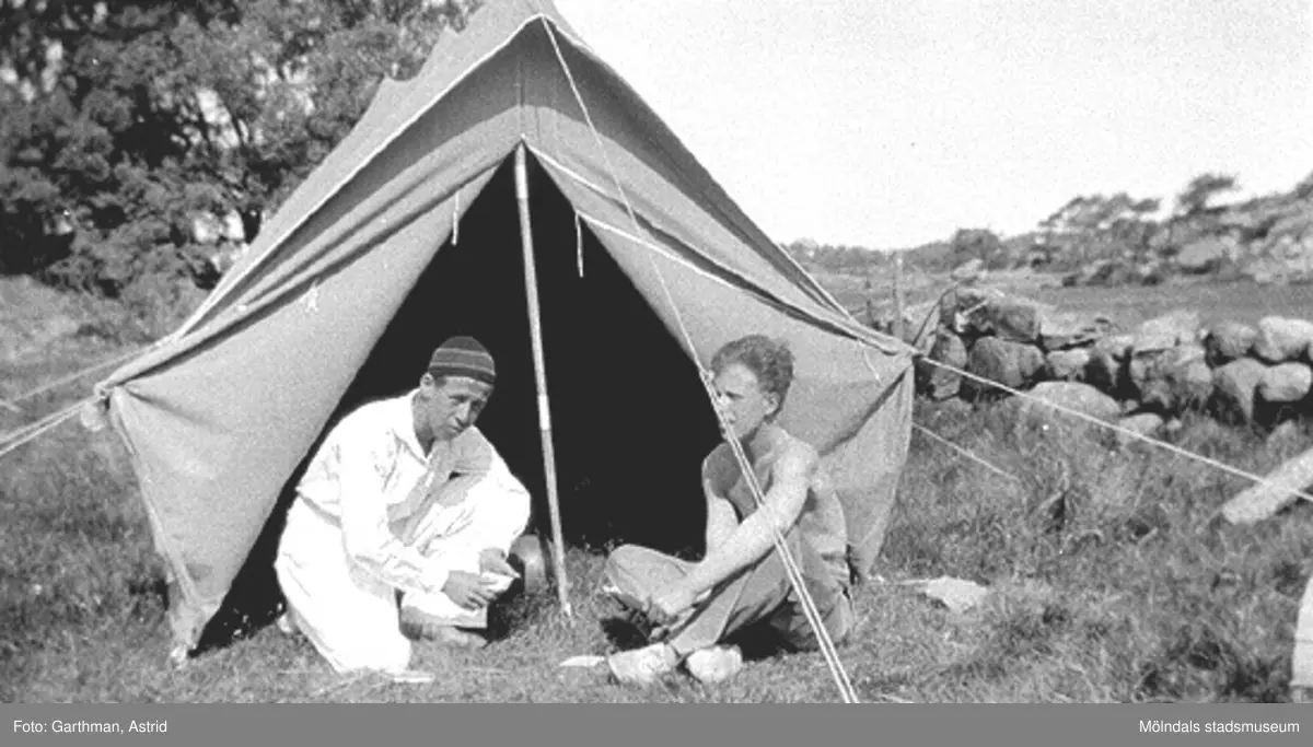 Bror Eriksson och Helmer Garthman spelar kort framför ett upprest tält i Fjärås, 1930-tal.