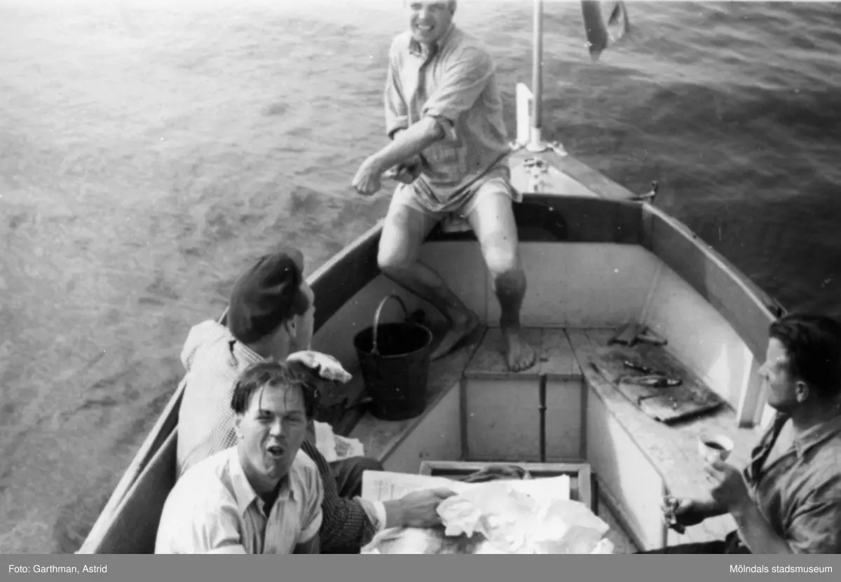 Helmer Garthmans jobbkompisar, från API, är ute med båt och fiskar. Näset, 1950-tal.