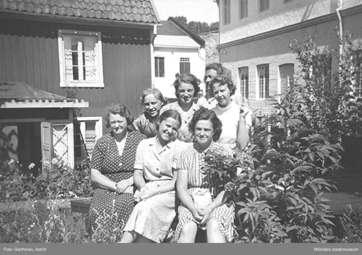 Sju kvinnliga arbetskamrater (okända för givaren) står/sitter i gräset framför ett hus och en fabrik. De är från "Lumpans" (Forsåkers fabriker), Kvarnfallet 31. Detta är öster om järnvägsvallen under 1950-talet.