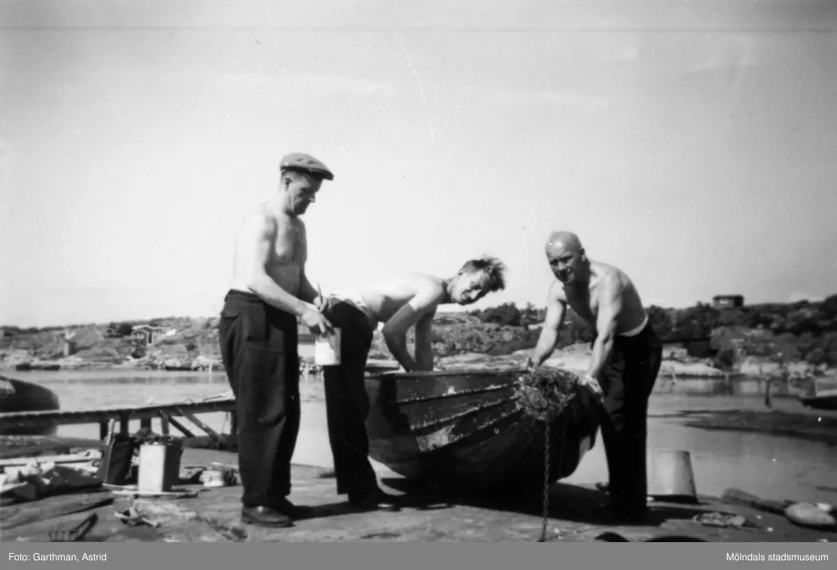 Familjen Garthmans båt målas. Från vänster: Helmer Garthman samt arbetskamraterna Arne Jansson och Charlie Magnusson. Näset, 1960-tal.