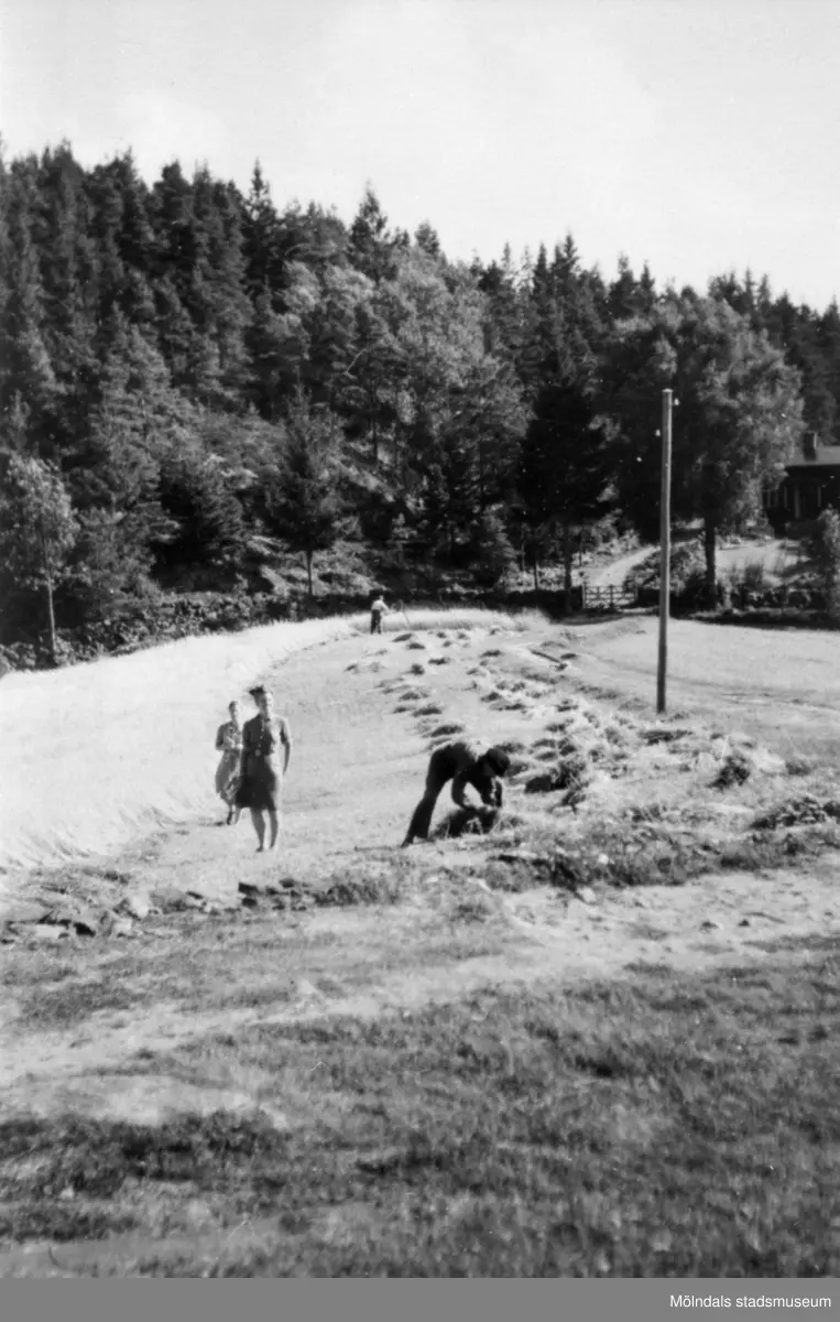 Familjen Arvid Svensson jobbar med slåtter av havre, Arvid slår av säden med lie, Sonjas föräldrar Augusta, Albert Persson knyter havreneker, i början av 1950-talet.