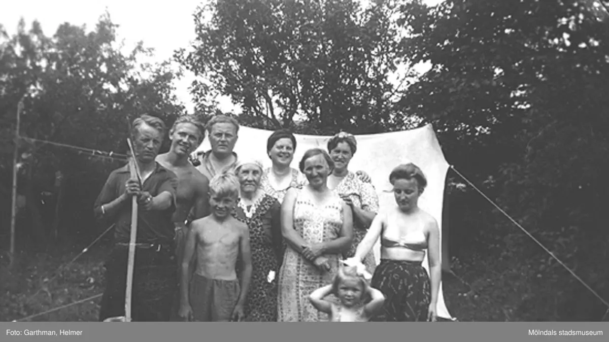 Helmer Garthmans släktingar i Fjärås, 1940-tal. Från vänster: Margit, Vera, Agnes, ?, Helmers syster; Gullan Andersson (född Garthman), Gustavs mor, gossen Roger, Gustav Andersson, Gunnar och Kalle.