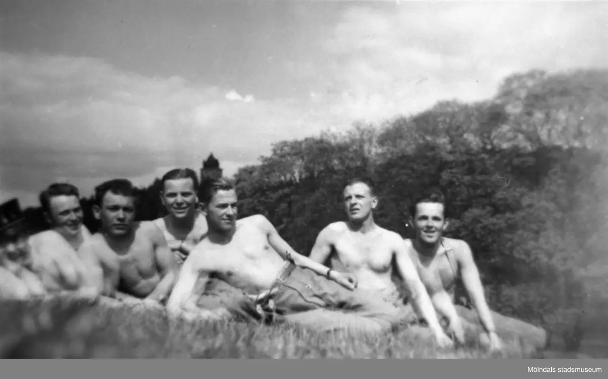 Sju män som halvligger/sitter i en grässluttning. "Lumparbild" från 1930-tal vid det militära under Helmer Garthmans rekryttid vid K 1* (Livregementet till häst, det yngre kavalleriet) i Stockholm. Helmer är den andre från höger, resterande är okända för givaren. Tillägg: *Livregementet till häst, K 1, var ett svenskt kavalleriförband tillhörande Kungl. Maj:ts Liv- och Hustrupper inom Krigsmakten, verksamt 1928-1949 inom Stockholms garnison i Stockholm.