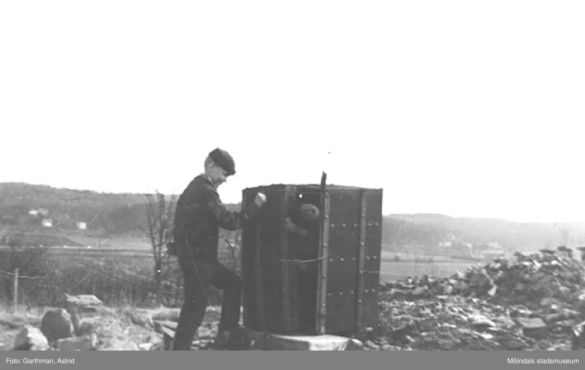 Roger Karlsson har stängt in Alf Garthman i en koffert. Balltorp, 1958.