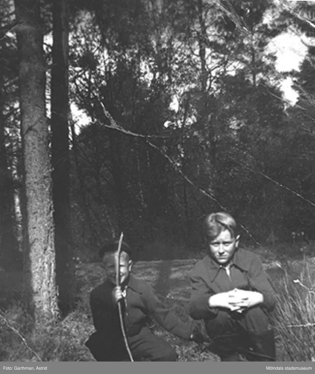 Bröderna Alf och Leif Garthman sitter på knä vid ett skogsområde i Balltorp. Början av 1950-talet.