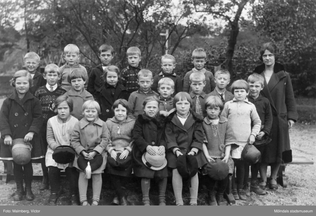 Flickor och pojkar i klass 1 uppställda utomhus vid Grevedämmets skola år 1927. Med på bilden är (givaren) Elsa Rosenberg (f. Olausson).