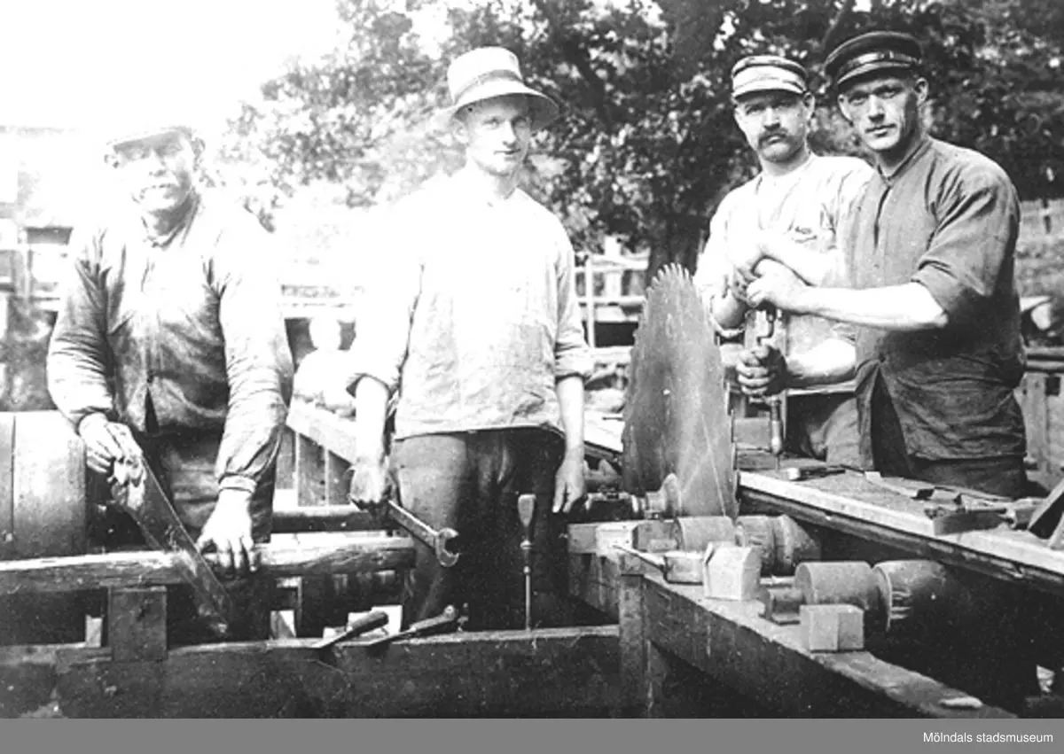Gruppfoto av arbete vid sågen. Personerna från vänster till höger är uppräknade i namnlistan ovan.