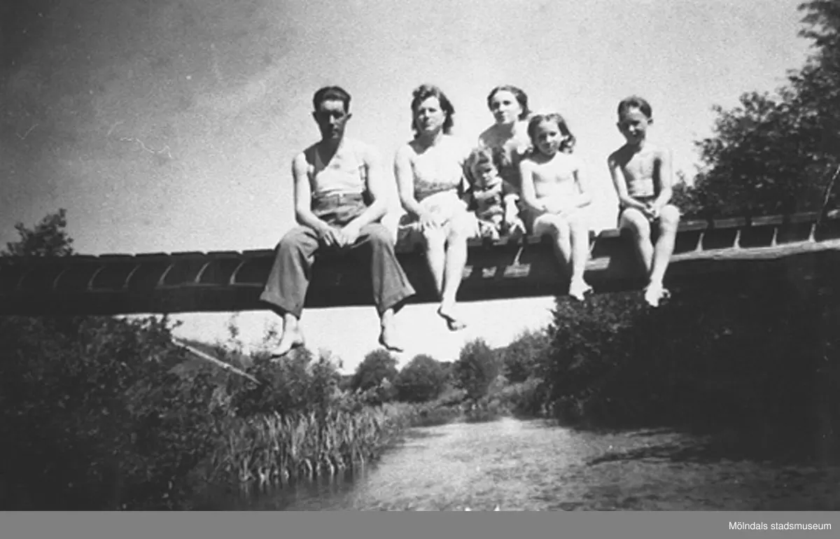 Utflykt vid Kungsbackaån. Vuxna och barn sitter på en bro som går över Lindomeån. På den tiden fanns en gångbro över ån och ibland badade man där om det fanns tillräckligt med vatten. Hösten 1944 flydde 32.000 estländare från kriget i Estland till Sverige. Ett sextiotal personer tog jobb på August Werners textilfabrik i Lindome.