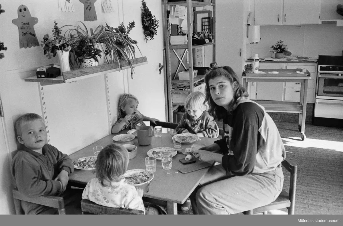 Linda Olausson och fyra barn sitter vid ett lågt bord och äter. På bordet finns använda tallrikar, glas, bestick och en plastbägare. Linda håller på med att skära upp en banan på ett fat. Hoppetossan, Katrinebergs daghem 1992.
