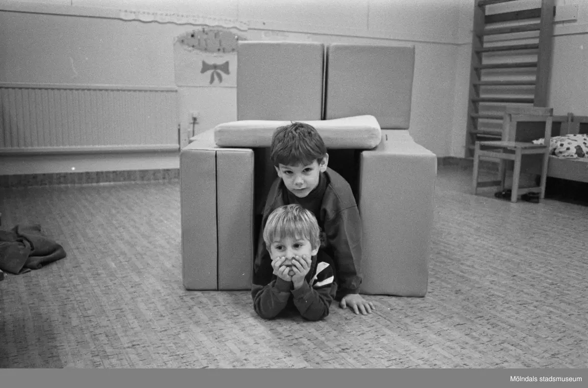 Två pojkar tittar fram från en egenbyggd koja. Den består av småkuddar som omringar dem på sidorna och ovanpå. I rummet kan man se en vägghängd ribbstol, en liten säng och en barnstol. På golvet ligger en kork-liknande linoleum-matta.