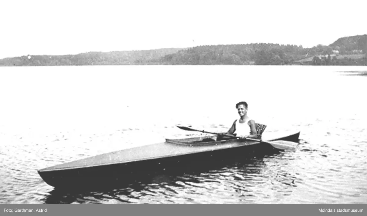 Helmer Garthman sitter i sin kanot på sjön Lygnern i Fjärås Bräcka, 1930-tal. Skänkt av sonen Alf Garthman som arbetade många år på Mölndals stadsmuseum.