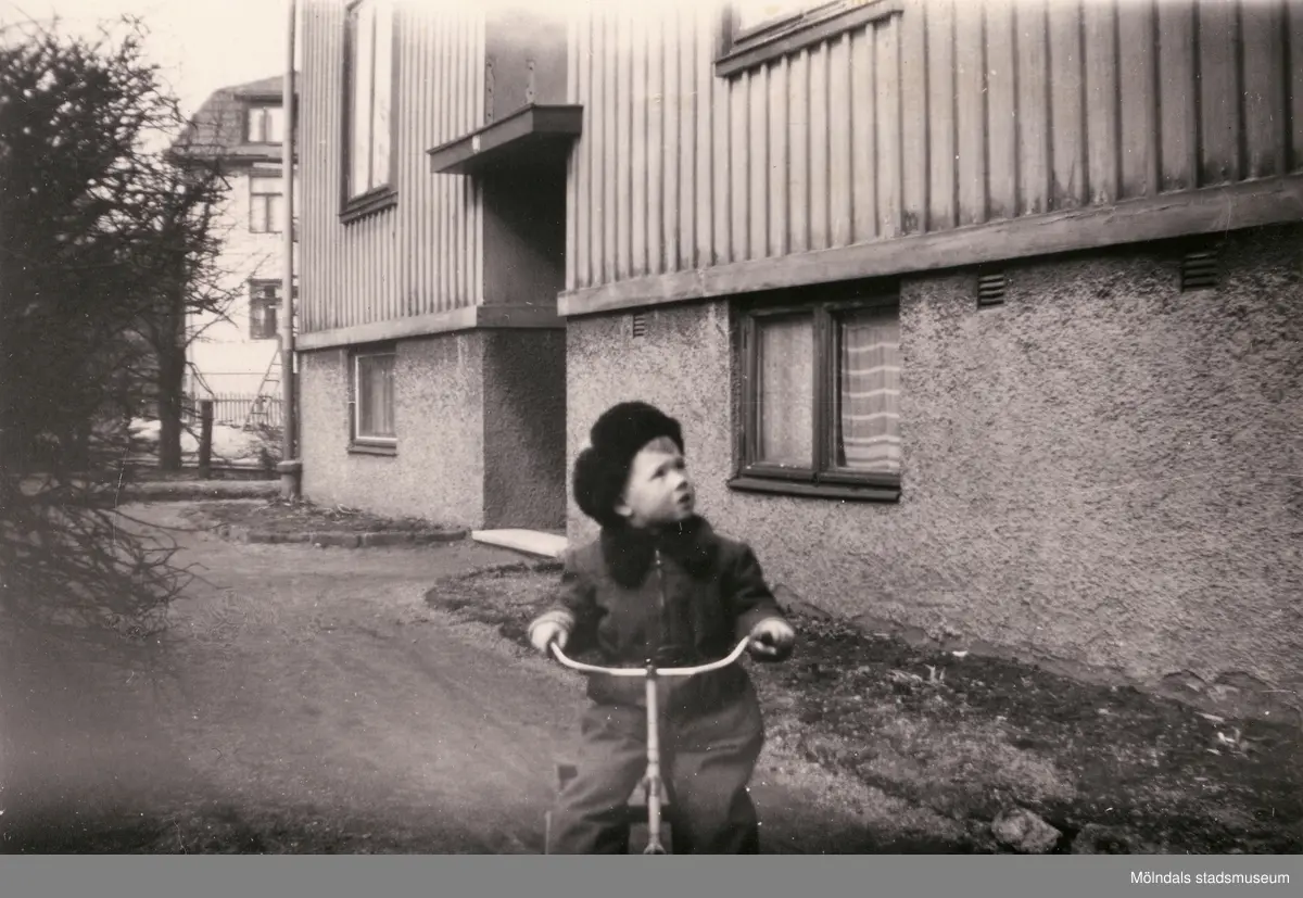 Thore Kristoffersson cyklar på trehjuling utanför huset Frölundagatan 20-22 i Mölndal, ca 1948-1949. Porten till nr 22 syns på bilden likväl som huset "Biljarden", gatunummer 26, i bakgrunden.
