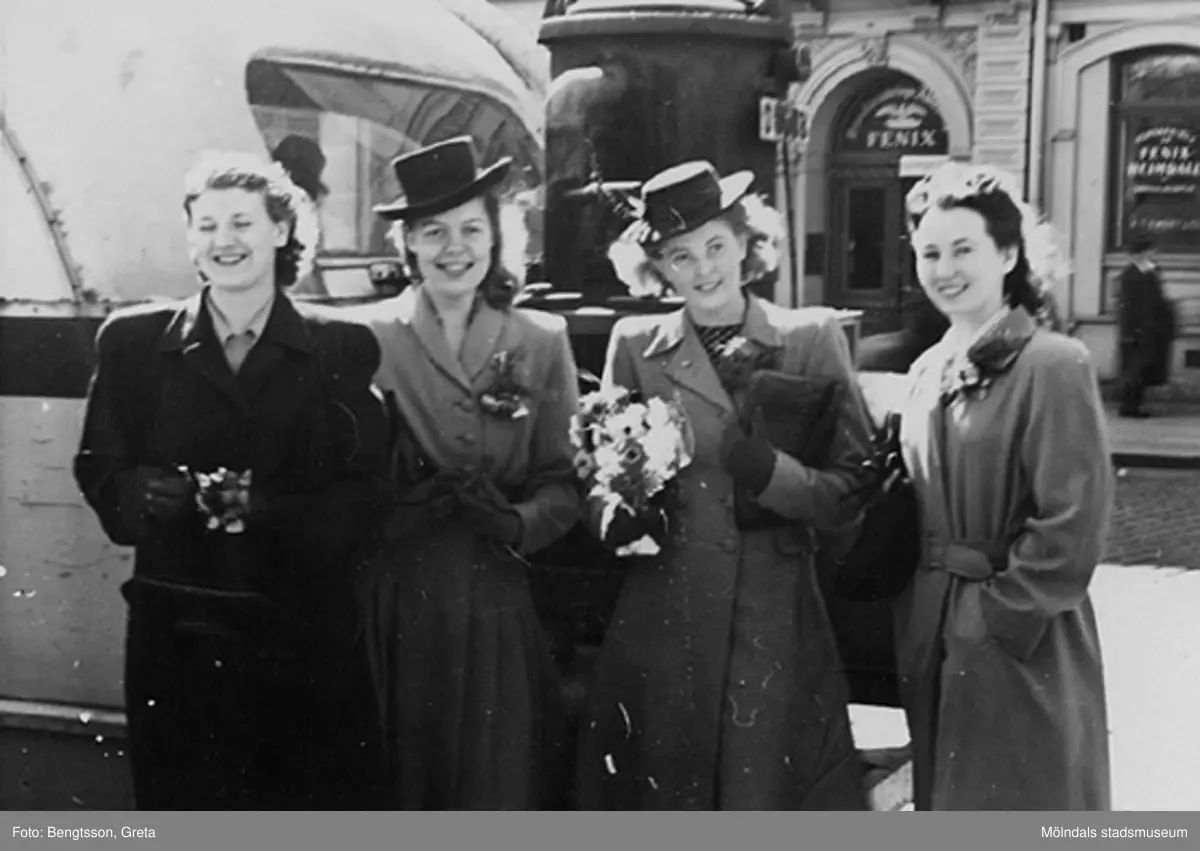 Vi firar FREDEN, åker in till Göteborg och lunchar på Gillblads, år 1945. Vi som firar är: Gerd Schreiber, Inger Larsson, Ulla Hultsten och Inger Classon.