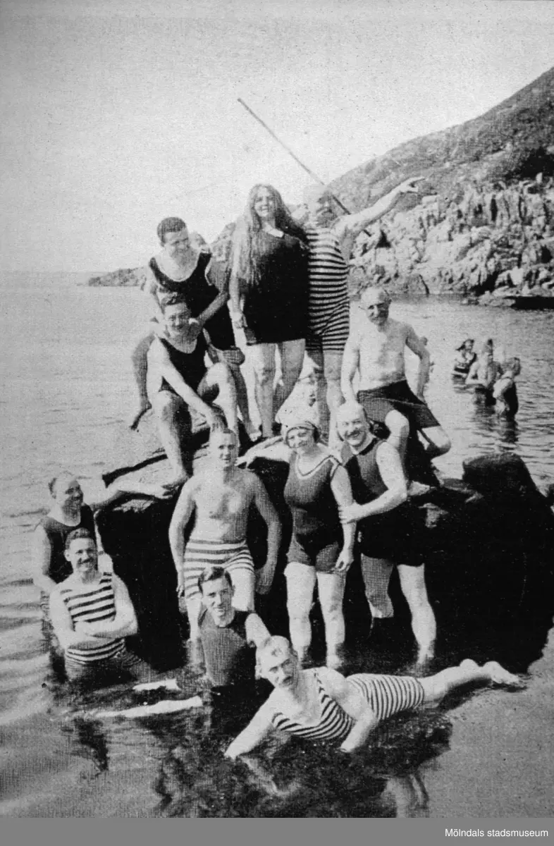 Badklädda personer poserar ståendes på något i vattnet, eventuellt vid Stenungsön, cirka 1930. Relaterade motiv: 2007_0287 - 0319.