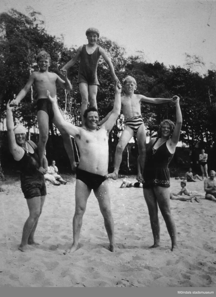 "Tulebos starke man" Karl Alberts (mannen i badbyxor) står i mitten på stranden vid Tulebosjön, 1930-tal.