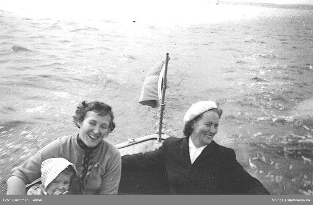 Anni Persson med sonen Tor-Leif och Astrid Garthman ute med familjen Perssons båt. Näset, 1950-tal.