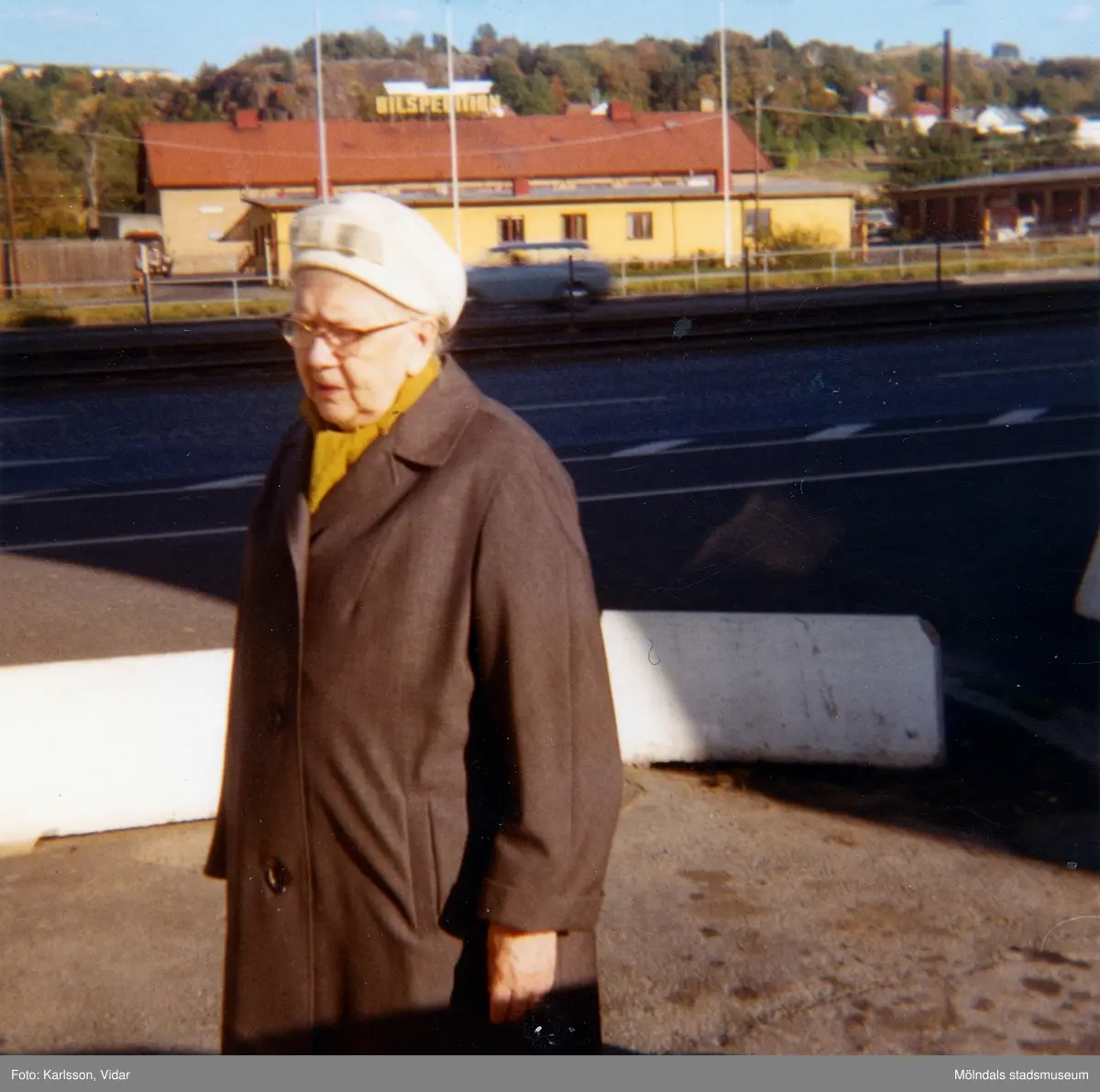 En glasögonprydd dam, klädd i brun kappa och vit hatt som står på Göteborgsvägen, år 1972. I bakgrunden syns spårvagnsspår, järnvägsspår och Ågatan.