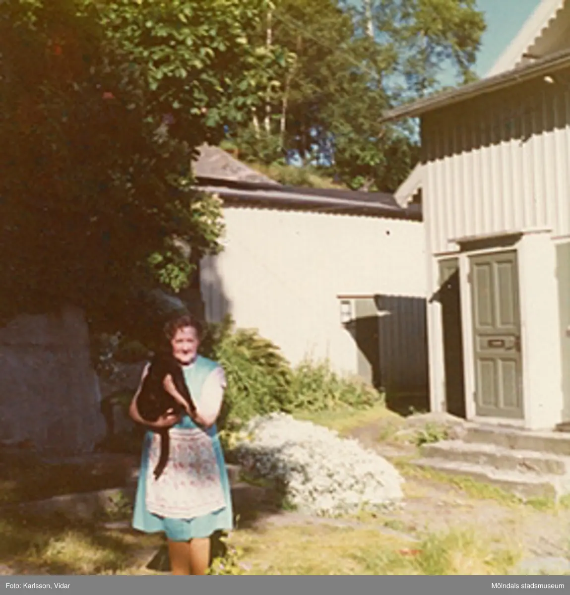 En kvinna står med en katt i famnen i trädgården till Roten F25.