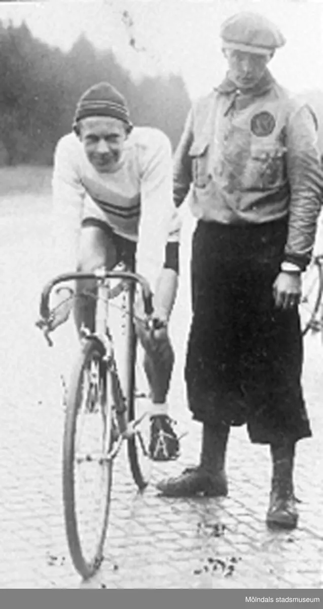 Detta är en av flera bilder ur Karl Nygrens album. Karl arbetade på Mölndalstryckeriet och kallades "Kalle tröckarn". Han var aktiv inom Mölndals cykelklubb (MCK).