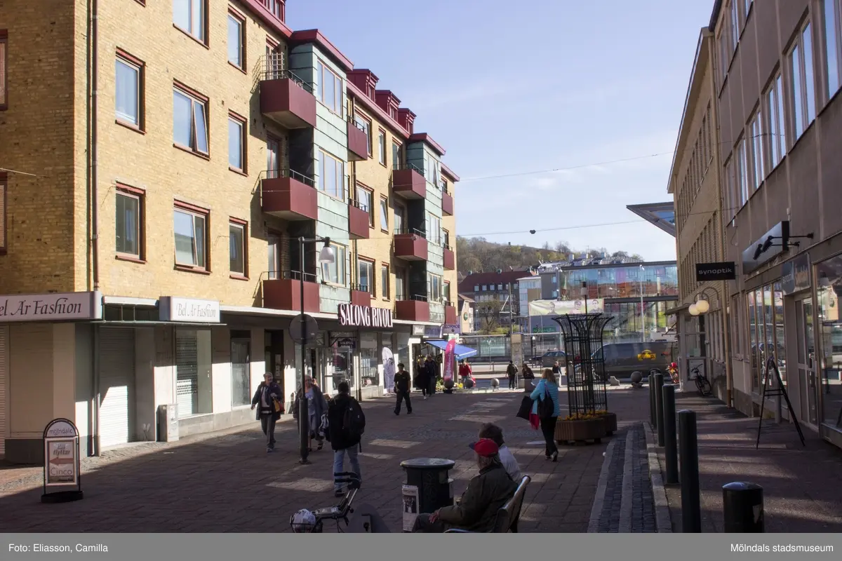 Brogatan f.d Frölundagatan med Centrumhuset till vänster i bild. Ett affärscentrum som kommer att förnyas. I fonden ser man Kvarnbyskolan, framför ligger Mölndals Bros hotell och innan det ligger den flerglastonade pendeltågstationen Mölndal station.