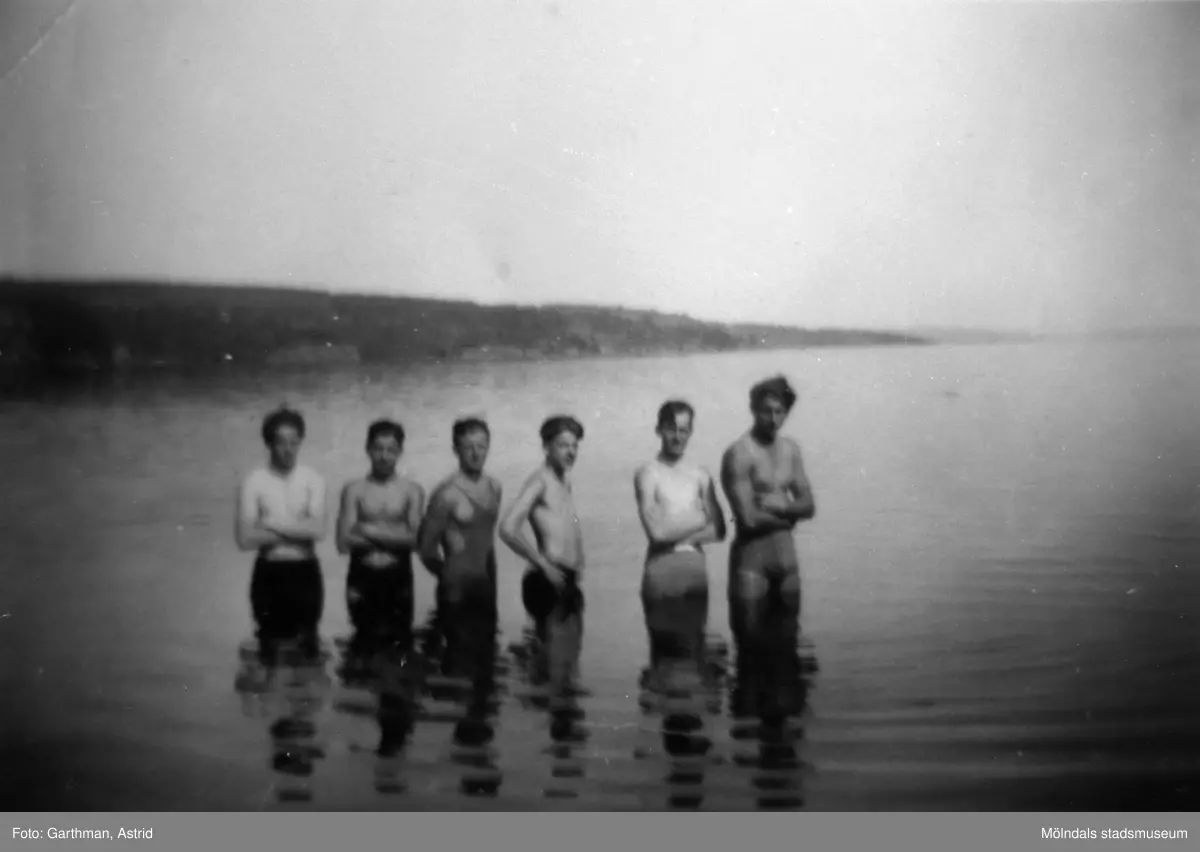 Sex unga män står i vattnet i sjön Lygnern, 1930- 40-tal. Från vänster: okänd, Gösta Gunnarsson, Helmer Garthman samt okända till höger.