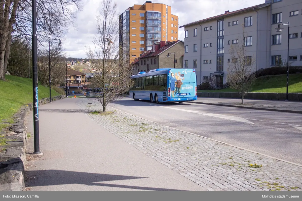 Söder om/nedanför Fässbergs kyrk Idag är en del av Storgatan (f.d Frölundagatan). Bostadsområdet till höger är Storgatan 22-30. Höghuset ligger på Storgatan 32A och nedanför detta påbörjas Brogatans affärscentrum.