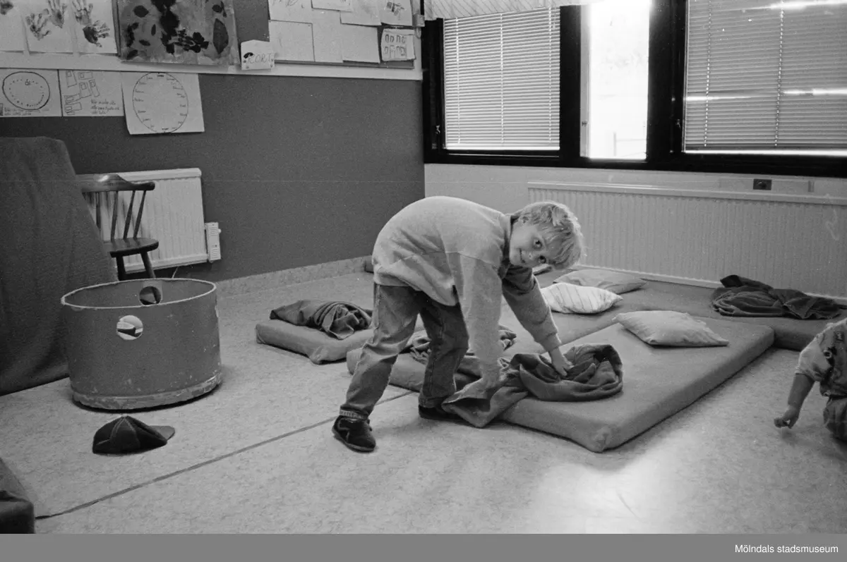 En pojke tittar leendes mot fotografen. Han lutar sig ned och håller på en filt som ligger på en madrass på golvet. På madrassen ligger en kudde. Kanske dags för en liten sovstund? Katrinebergs daghem, 1992.