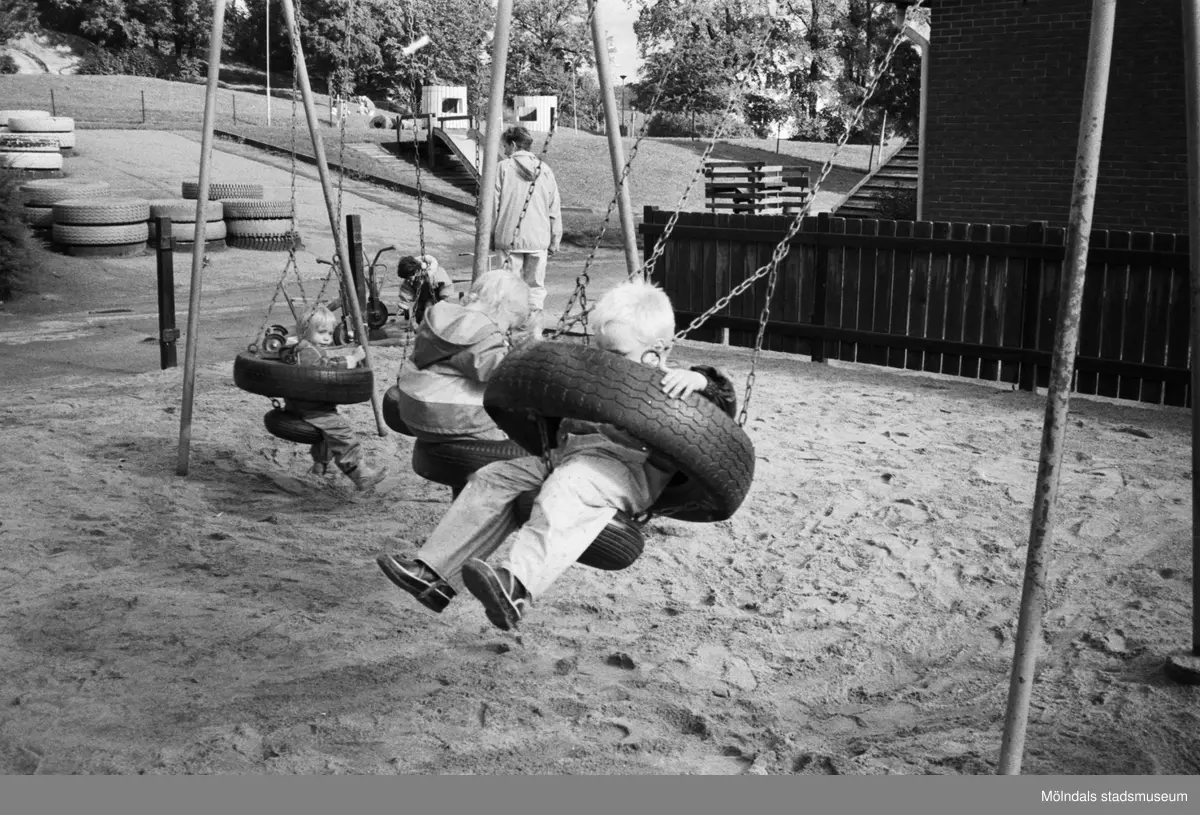 Tre barn gungar i en gungställning som står i en stor sandlåda. I bakgrunden står en fröken med ett annat barn. Längre bort ser man stora däck man kan klättra i. Katrinebergs daghem, 1992.