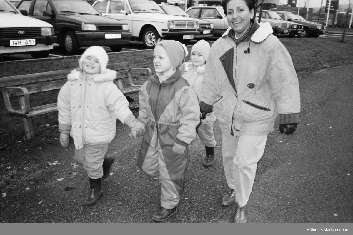 Tre vinterklädda barn och en fröken går på en grusgång. Utefter kanten står en bänk och i bakgrunden ser man parkerade bilar. Katrinebergs daghem, 1992.
