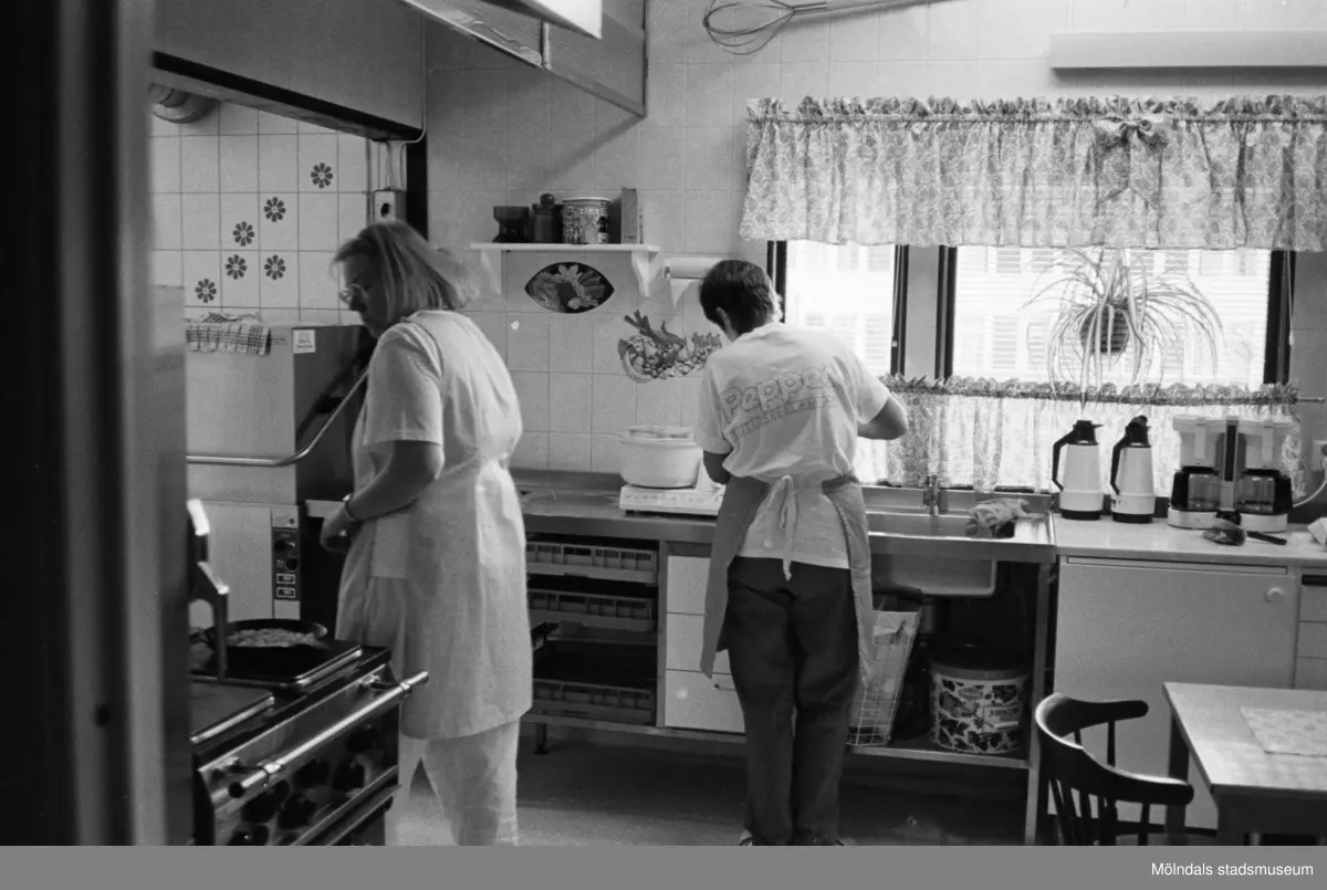 Christina Brussard och Kate Palm i köket på Katrinebergs daghem, 1992-93. Båda bär förklädde. Den ena kvinnan står vid sidan av spisen, den andra kvinnan diskar. På hennes t-shirt står "PEPPES FRITIDSREKLAM" tryckt på ryggen. I bakgrunden syns fönster.