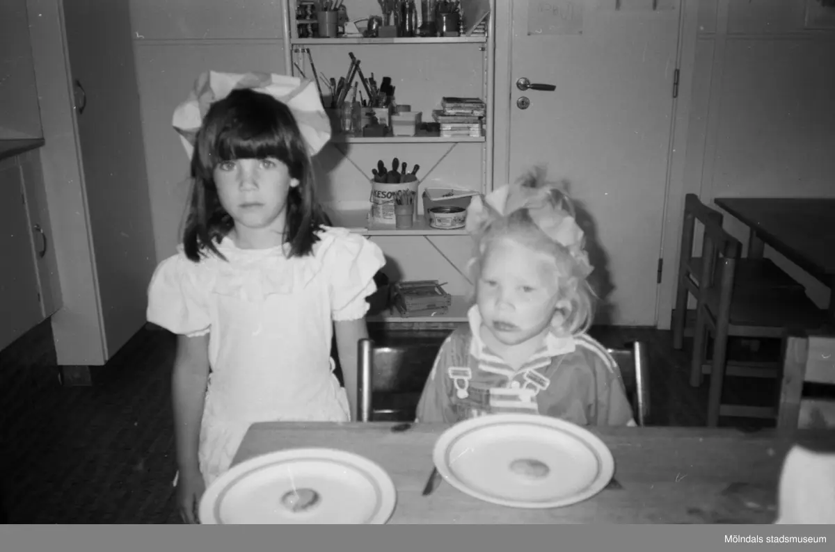 Två flickor står inomhus bakom ett bord på Katrinebergs daghem. På bordet står två tallrikar med var sin kaka på. Båda flickorna har dekoration i håret. I bakgrunden står en hylla innehållande pysselprylar.
