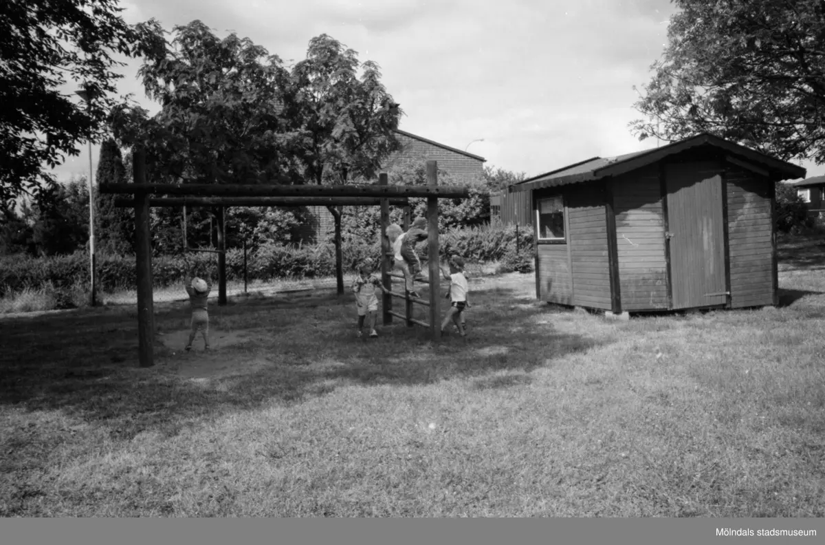 Flera barn som leker i en klätterställning på en gräsmatta utanför Katrinebergs daghem. Ett förråd står vid sidan om. 1992-93.