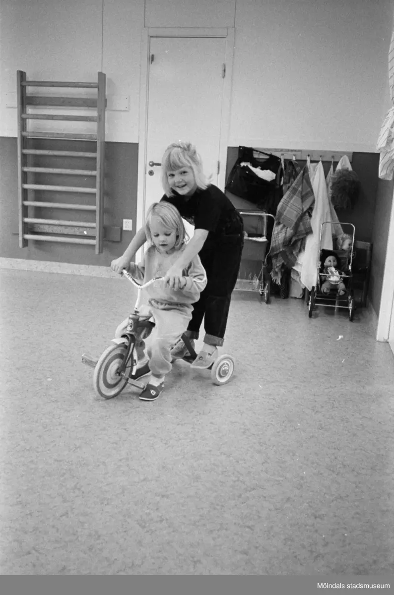 Två barn som sitter alternativt står på en trehjuling inomhus på Katrinebergs daghem. I bakgrunden ser man en ribbstege av trä uppsatt på väggen, några dockvagnar och filtar.