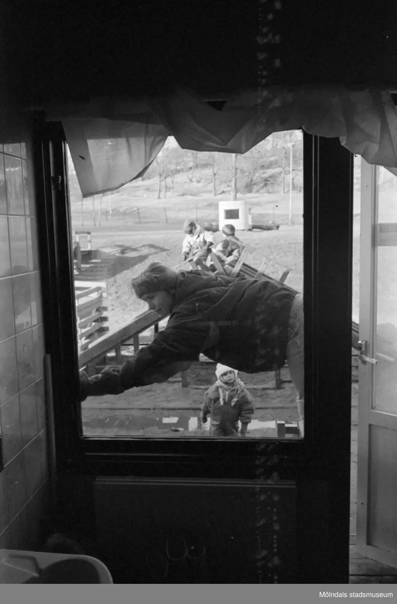 Bild fotograferad inifrån och ut genom ett fönster från Katrinebergs daghem. En balkongdörr till höger är lite öppen. Utanför syns en vuxen person med mössa som lutar sig över ett staket. Lite längre bort ses vinterklädda, lekande barn.