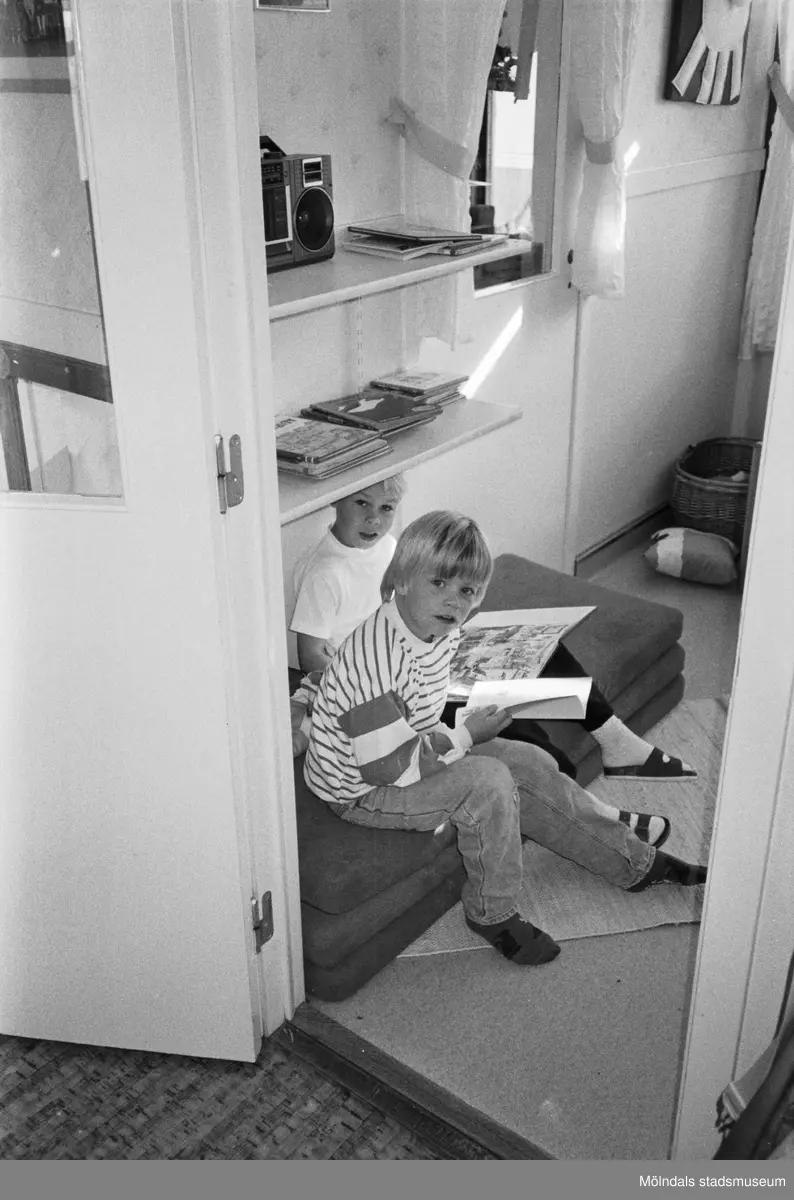 Två pojkar sitter på tre mindre madrasser i ett rum och bläddrar i var sin bok. De är fotograferade ifrån ett intilliggande rum, genom en dörr-öppning, och de sitter precis innanför. Katrinebergs daghem, 1992.