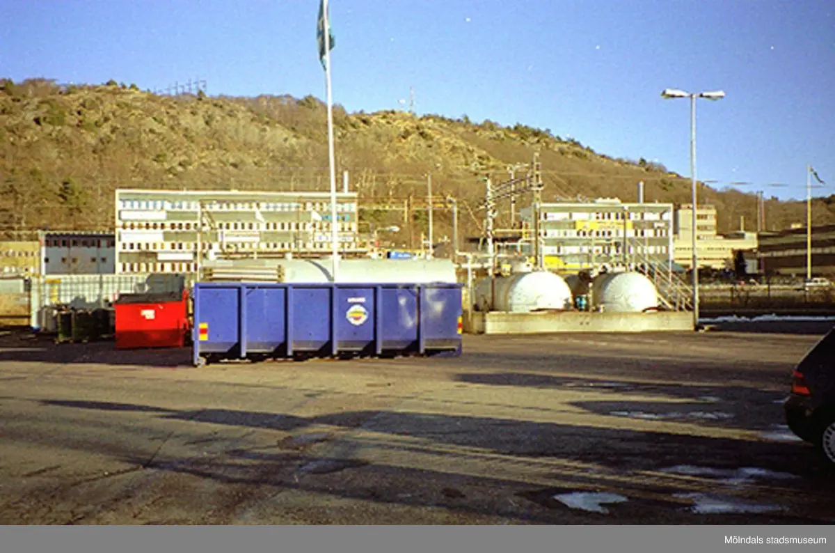 Byggnadsdokumentation av Akzo Nobel på Ågatan 44 i Lackarebäck, 2000-02-15. Rallarberget ses i bakgrunden.