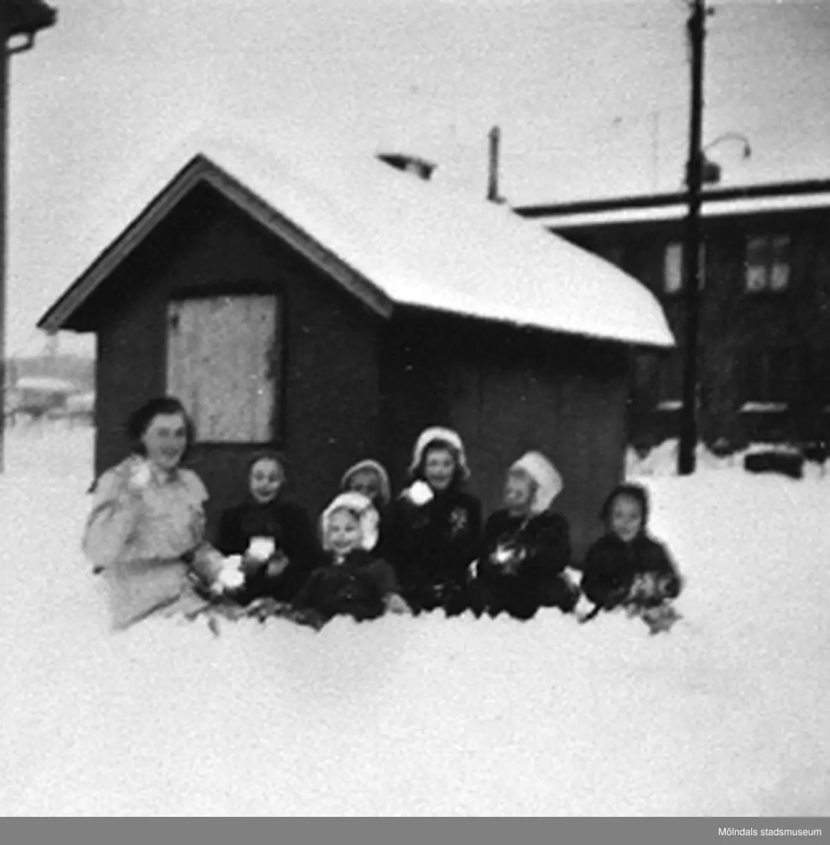 En lärare med barn vid Krokslätts daghem, Dalhemsgatan 7 i Krokslätt, 1948 - 1951.