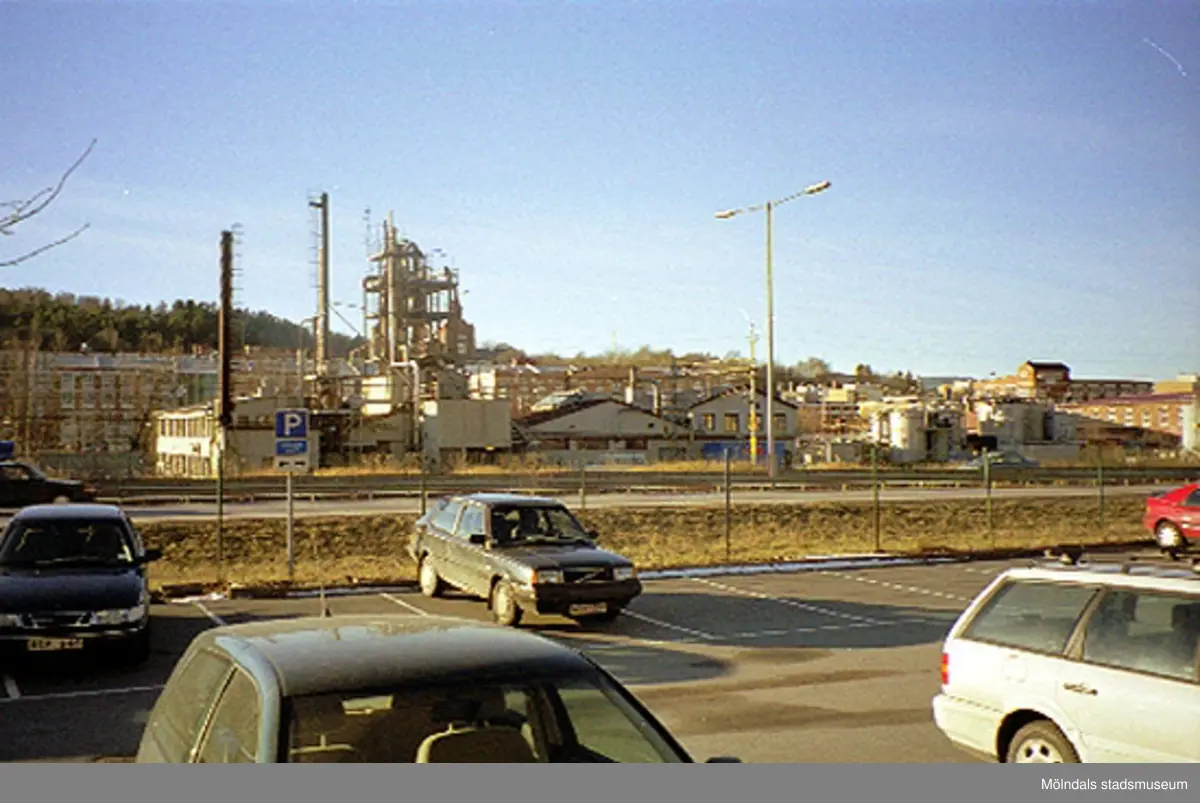 Byggnadsdokumentation av Akzo Nobel på Ågatan 44 i Lackarebäck, 2000-02-15. Fasader mot öster. Krokslätts fabriker skymtar i bakgrunden.
