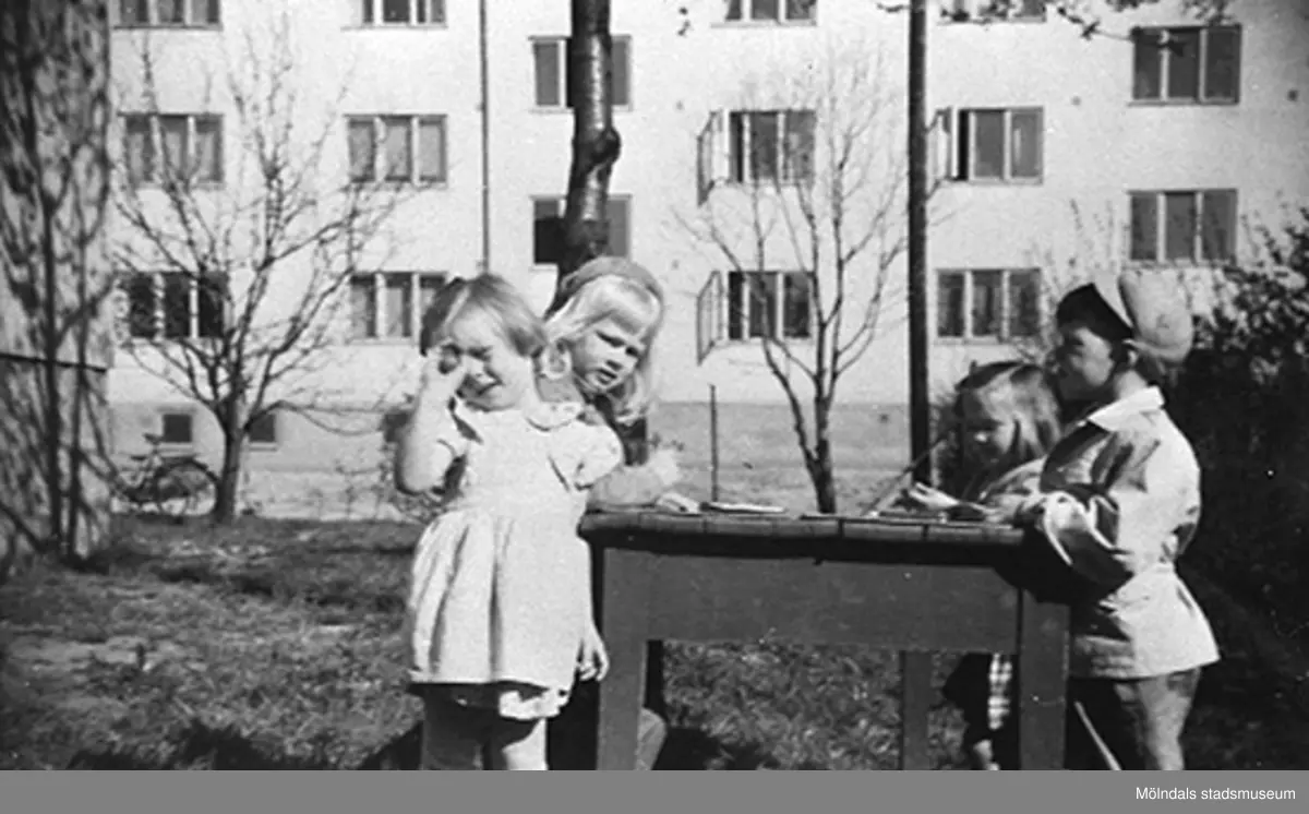 Fyra barn utomhus vid Krokslätts daghem, Dalhemsgatan 7 i Krokslätt 1949. Bostadshuset i bakgrunden är Dalhemsgatan 10 - 12.