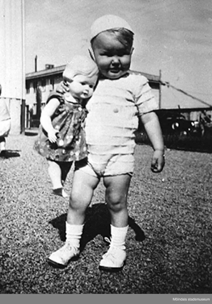 Ett litet barn som håller en docka vid Krokslätts daghem under Margit Emilssons (gift Wannerberg -52) praktik som biträde