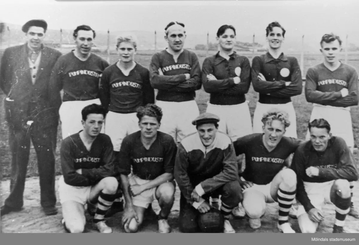 API fotbollslag uppställda vid fabriken A.B. Pumpindustri med fabriksreklam på tröjorna, 1950-talet. Med på bild: Rune Åkersson och Mossberg.